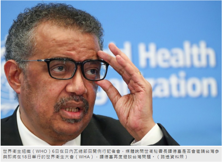 世界衛生組織(WHO)6日在日內瓦總部召開例行記者會,媒體詢問世衛秘書長譚德塞(Tedros Adhanom Ghebreyesus)是否會邀請台灣參與即將在18日舉行的世界衛生大會(WHA),譚德塞再度避談台灣問題,由世衛法律顧問代答稱應由會員國決定。