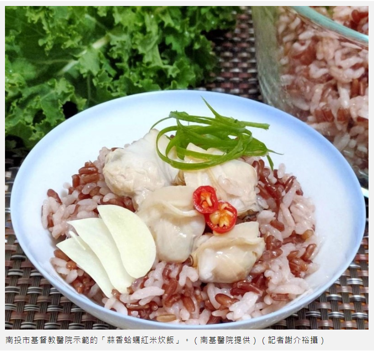 南投市基督教醫院營養師周孟穎說,首先是「蒜香蛤蠣紅米炊飯」,以新鮮的蛤蠣來做炊飯,紅米含有抗氧化的花青素及微量元素如鐵、鋅、硒等,不過,因吃起來的口感有點類似糙米,大多數牙口不好的長輩較難接受,所以搭配蛤蠣一起蒸煮,增加米飯濕潤度也較好入口消化。