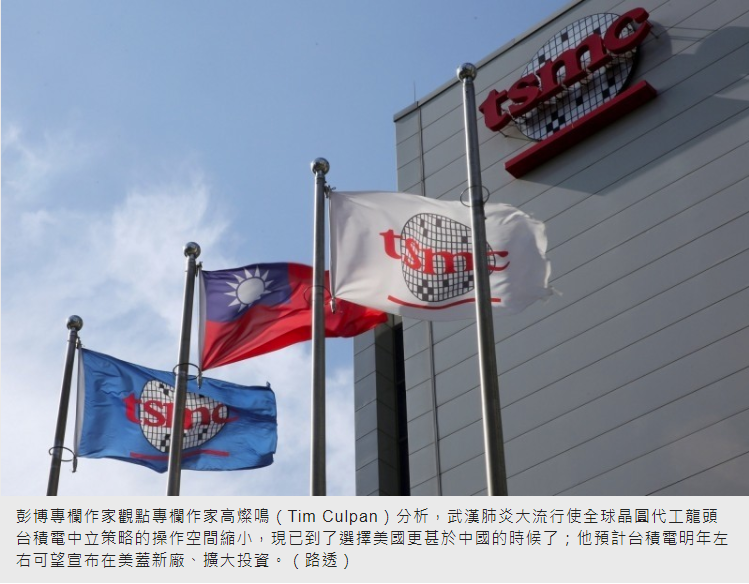 彭博觀點專欄作家高燦鳴(Tim Culpan)11日撰文指出,武漢肺炎(新型冠狀病毒疾病,COVID-19)大流行使全球晶圓代工龍頭台積電中立策略的操作空間縮小,疫情凸顯華盛頓有必要保護供應鏈不受擾斷、及對依賴台廠代工晶片的擔憂;台積電則面臨美國市場佔公司營收近6成、川普政府考慮限制向中企供應晶片的新規,可能已到了必須選擇美國更甚於中國的時候,他預計台積電明年左右可望提出在美國鉅額投資的建新廠計畫。