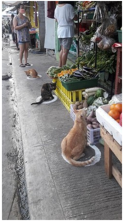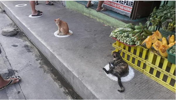 如同台灣超商會在地上貼標示點,提醒排隊結帳的民眾保持社交安全距離,菲律賓這間蔬菜店也在地上畫了圈圈當標誌。你看這圈圈畫得又圓又整齊,連不吃菜的浪貓都知道要照著圈圈排隊了......咦?不要占用人家的排隊位置啦!