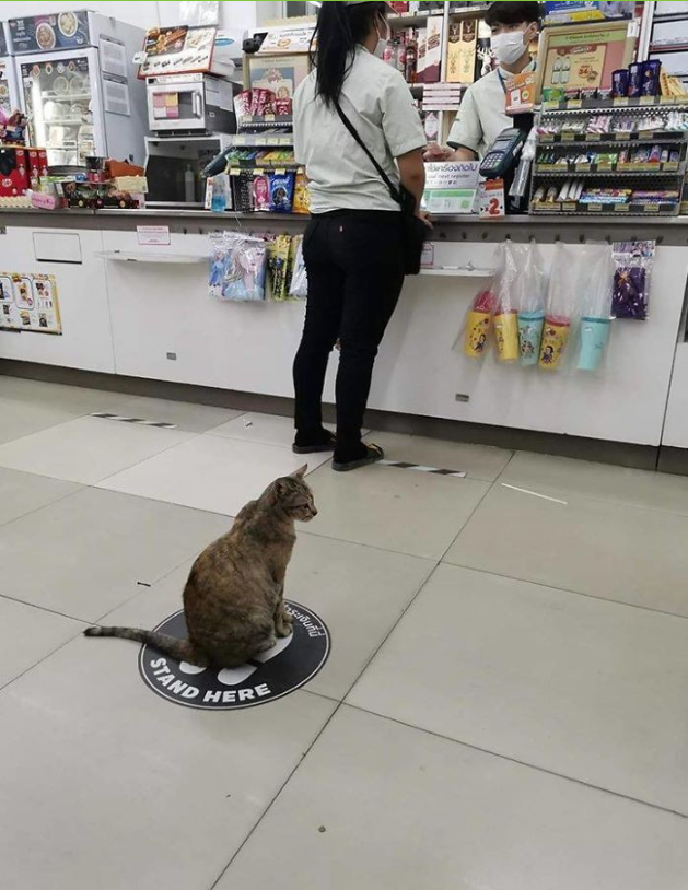 前段時間也有人在泰國超商捕捉到,貓咪穩穩坐在排隊圈圈內的模樣。