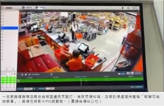 有民眾在網路PO文爆料指出,一名家樂福身障店員在結帳區遭民眾毆打,店長到場處理時竟稱「報警可能被解僱」,氣得他將影片PO網質疑,網友看到也紛紛質疑,店長不是應當保護自己的員工?