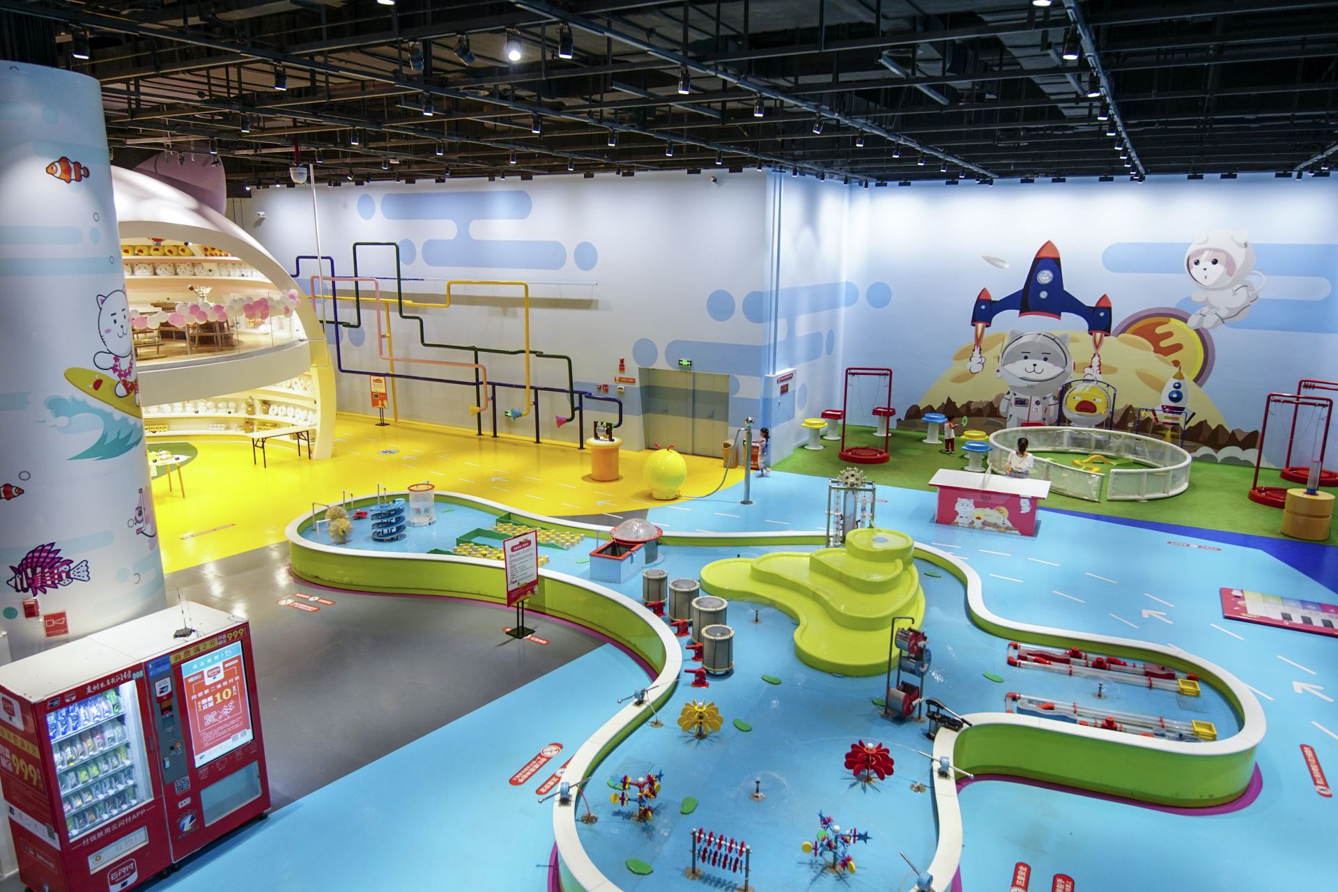 園區四處可見繽紛的剪紙掛旗,地上佈滿獨有的藝術花毯,廣達200坪的場地瞬間變成中南美洲的小鎮,像是在墨西哥運河中有著熱鬧的水市集,小朋友可體驗當小小老闆販售物品;以金字塔為造型設計的「奇琴金塔池」則有刺激水道讓孩童撈球玩水,甚至還有沙漠仙人掌場景,營造異國風的遊戲天堂。