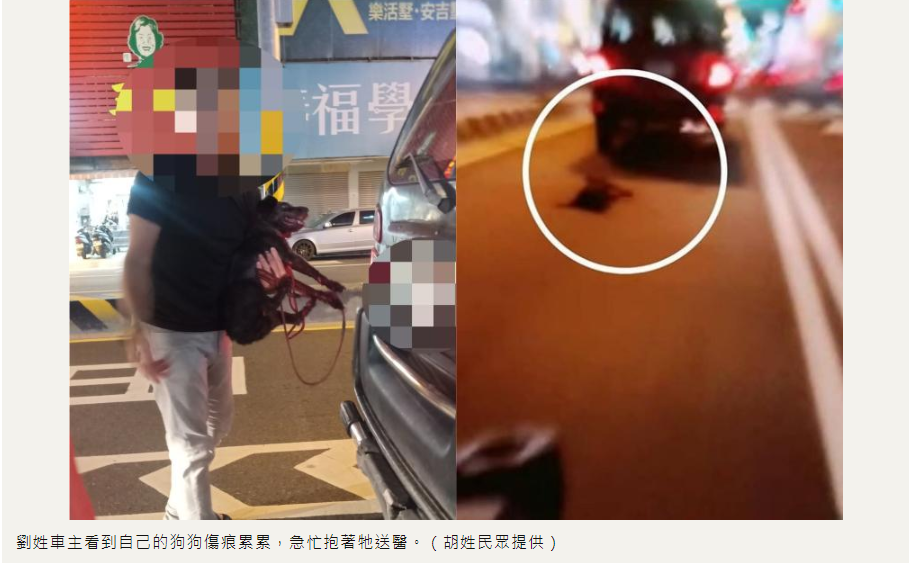 據目擊胡姓民眾指出,自己當時剛下班,正巧與女友視訊才拍下現場狀況。第一時間有在停紅燈時,用手勢告知車主有狀況,但可能因為車主沒注意到,並沒有理會。後續小狗又被一路被拖行數公里後,有兩名駕駛對著車主狂按喇叭、阻擋去路,這才讓車主察覺不對勁,下車一看,發現自家愛犬被拖在後方,早已傷痕累累⋯⋯。