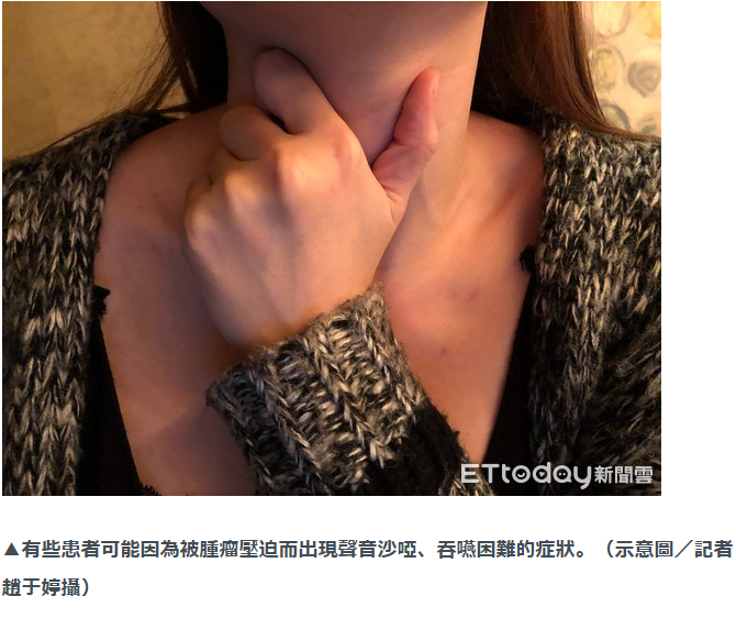 甲狀腺癌最典型也最常見的症狀就是脖子出現異常的腫塊,蘇裕傑醫師表示,其實脖子的腫塊患者自己很容易就可以摸到,並不難察覺,但是由於甲狀腺癌的腫塊不痛不癢,很容易被民眾所忽略,而錯失早期治療的時機。然而,隨著腫瘤變大,亦可能壓迫到食道、氣管而伴隨出現聲音沙啞、莫名咳嗽、呼吸不暢、吞嚥困難或有異物感等症狀。