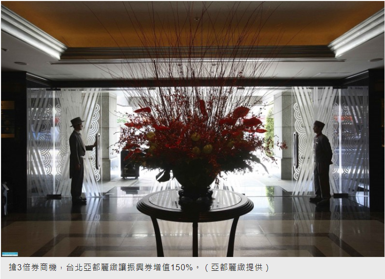 搶振興3倍券商機,台北亞都麗緻大飯店指出,指定客房專案入住可享1,000元振興券扺2,000元,以及全館餐廳自由選,3,000元振興券可抵用4,500元,增值150%的面額價值。
