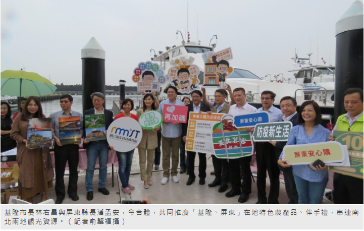 隨著國內疫情趨緩,「防疫新生活運動」上路,基隆市長林右昌與屏東縣長潘孟安,今日早上8點40分在基隆碧砂漁港合體,共同推廣「基隆、屏東」在地特色農產品、伴手禮,串連南北兩地觀光資源;林右昌與潘孟安呼籲國人多多利用交通部安心旅遊補助,搭配振興劵到基隆、屏東出遊,刺激在地經濟。