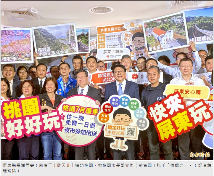 鄭文燦介紹,桃園有小烏來天空步道,屏東有山川琉璃吊橋,桃園有竹圍、永安漁港,屏東有潮州、東港,很多人去過峇里島、普吉島,但沒有去過小琉球、澎湖等離島,桃園會陸續與各縣市合作,共同推廣防疫互惠旅遊,讓更多旅遊業者受惠。