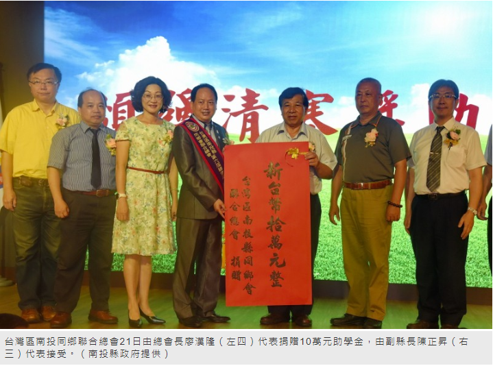 南投縣政府敎育處指出,台灣區南投縣同鄉會聯合總會是凝聚旅外南投鄉親向心力的團體,會員大都是事業有成的企業菁英,不僅熱心公益,也關心故鄉產業發展、關懷弱勢族群,更關心南投故鄉敎育,2年內捐款助學3次,金額累計達30萬元,幫助了150位家境清寒學生。