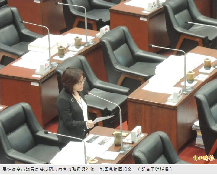 民進黨高市議員康裕成今質詢時指出,不少商家收取先前韓市府團隊規劃的租車振興券後,很擔心能否向高市府兌換回現金?高市代理市長楊明州答詢時掛保證,強調絕對可以。