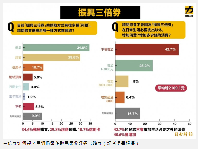 民調顯示,有關振興三倍券,民眾預計領券的方式依序為郵局購買34.6%、超商預購29.8%、信用卡10.7%、網站預購5.0%、行動支付3.0%及電子票證1.2%。偏向以郵局購買、超商預購、網站預購這三種領取實體券的民眾比例達到69.4%,而偏好以電子票券領取的民眾僅有14.9%。