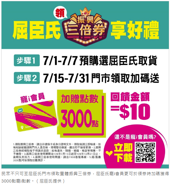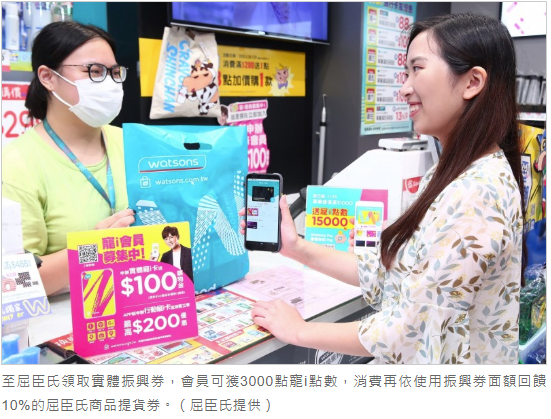 7/1至8/14期間,凡持實體振興券至全台屈臣氏消費,屈臣氏將依據使用的振興券面額回饋10%的屈臣氏商品提貨券,意即使用200元面額振興券一張、贈送20元商品提貨券;使用500元面額振興券一張、澎湖自由行贈送50元商品提貨券,可累送不限數量,消費越多回饋越多。