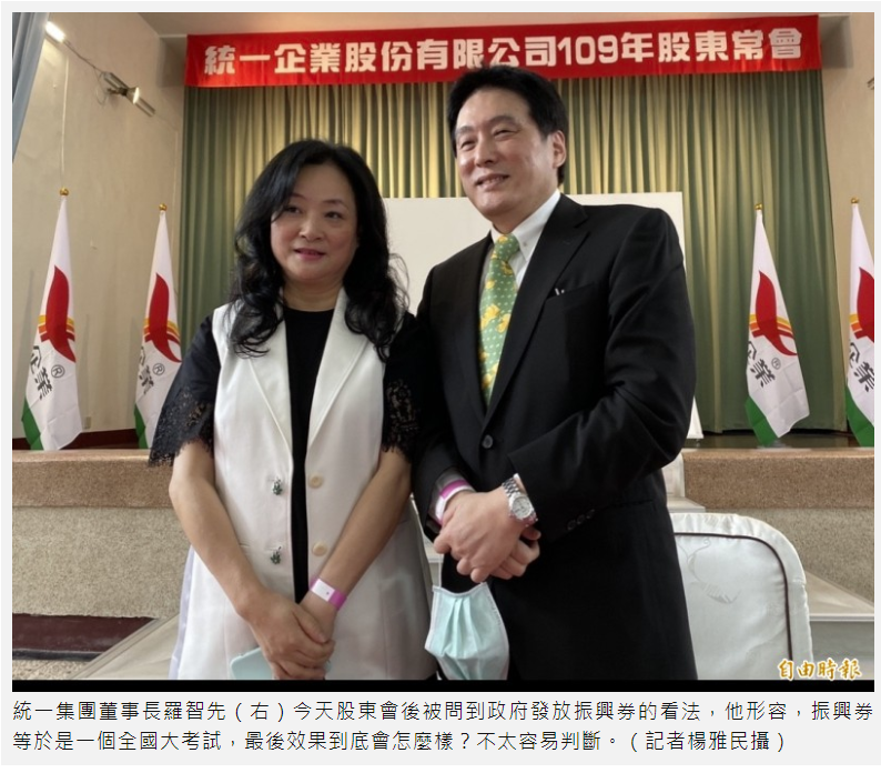 統一集團董事長羅智先今天股東會後被問到政府發放振興券的看法,他形容,這是個很有趣的題目,振興券等於是一個全國大考試,統一集團旗下品牌也在觀察情況,各方加碼都愈加愈多,不好出牌啦。