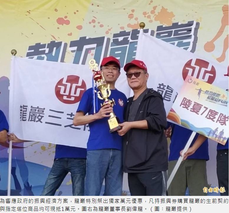迎接後疫情時代,龍巖表示,為響應政府的振興經濟方案,特別祭出獨家萬元優惠,凡持3000元振興券購買龍巖的生前契約或指定塔位商品均可現抵1萬元,也就是讓消費者花1千元購買3000元振興券即可享有萬元折抵優惠。