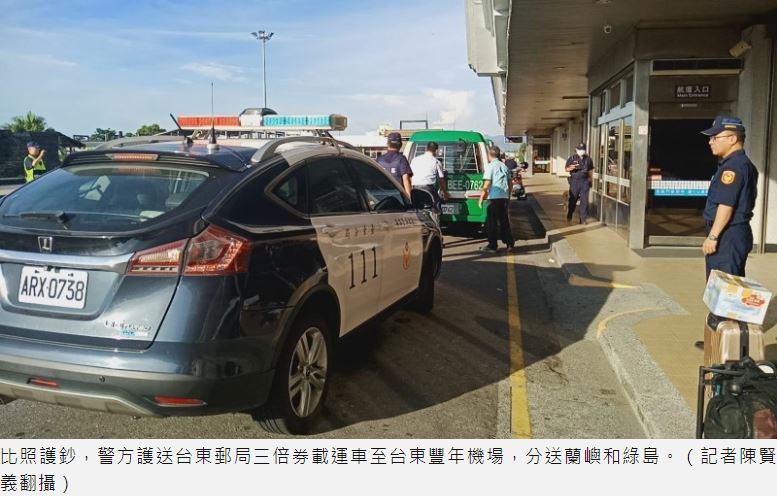 比照護鈔規格,台東警方今晨嚴陣戒備,護送紙本三倍券上飛機前往蘭嶼和綠島;另外位居偏鄉的金峰鄉由於沒有超商和郵局,警方也伸援,鄉民不須排隊、預訂,直接攜證件到分駐所領取就好,首波已審核完畢,第2波登記是8月1日至8月7日,若有不便可商請警方協助。