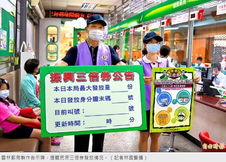 吳順吉說,目前雲林郵局已配發14萬套三倍券,也配發到各支局,不過,因無法預估每個郵局購領情況,也製作即時看板,告知排隊民眾三倍券出售及庫存的情況。