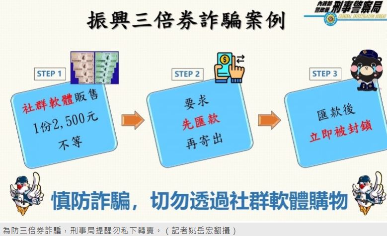 刑事局指出,新北市21歲林姓男子在臉書社團看見有人以2500元販賣三倍券,以為撿到便宜,立刻聯繫賣家下單4份,沒想到匯款1萬元後,不但沒寄來三倍券,甚至直接封鎖他,才驚覺遇上詐騙,立刻向新北市三峽警分局北大派出所報案。