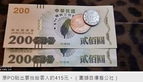 該網友在臉書「爆廢公社」PO出1張照片,可以看到照片中有2張面額200元的三倍券與10元、5元銅板各一個,原PO在貼文中表示「昨天一個客人問說:『老闆有收卷嗎?是500的有找零嗎?』我說有,結果買了雞排跟雞心85元,我找了415元給客人,結果他眼睛睜大大的一直看我,請問500-85=415,沒錯啊!還是我做錯了什麼?」