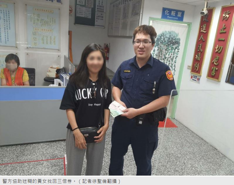 黃女前來派出所領三倍券,她不斷感謝警方表示,回家之後三倍券消失無蹤,她完全想不到到底是掉在哪邊,原本都已經放棄,直到警方來電說「找到了」,才讓她再度展開笑顏。