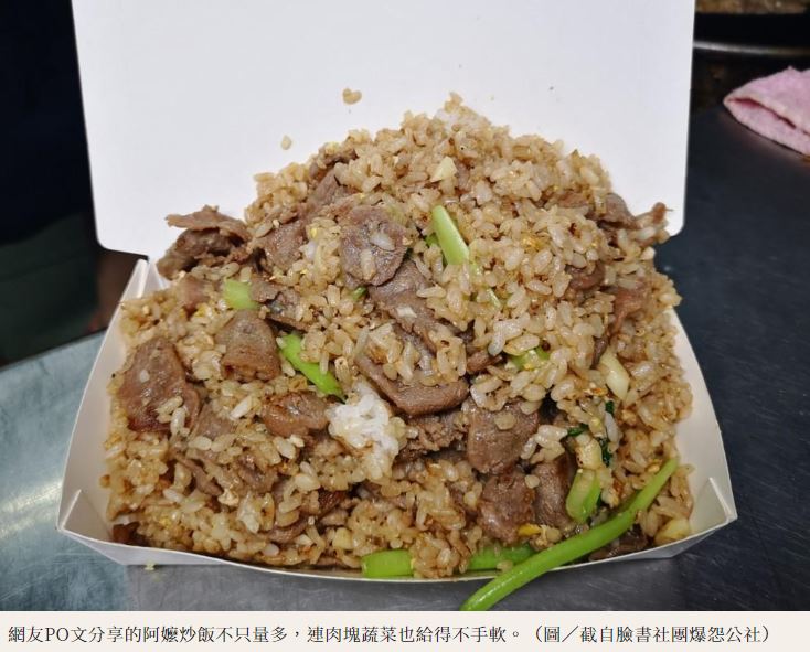 炒飯滿到便當盒裝不下,竟能分兩餐吃?近日有網友在臉書社團「爆怨公社」發文分享,她到楠梓區右昌一家小吃攤,買了50元肉絲炒飯、70元羊肉炒飯當消夜,沒想到身兼廚師的阿嬤瘋狂添飯、加肉,一邊說「給你兒子吃飽一點」,大爆滿份量堆成一座小山,連紙盒都蓋不起來,最後還用塑膠袋打包裝不下的份,讓原PO忍不住控訴「跟老公小孩3人一起吃2份炒飯,卻多到連隔天早餐也一併解決」,只好上網分享請大家不要放過這家阿嬤炒飯。