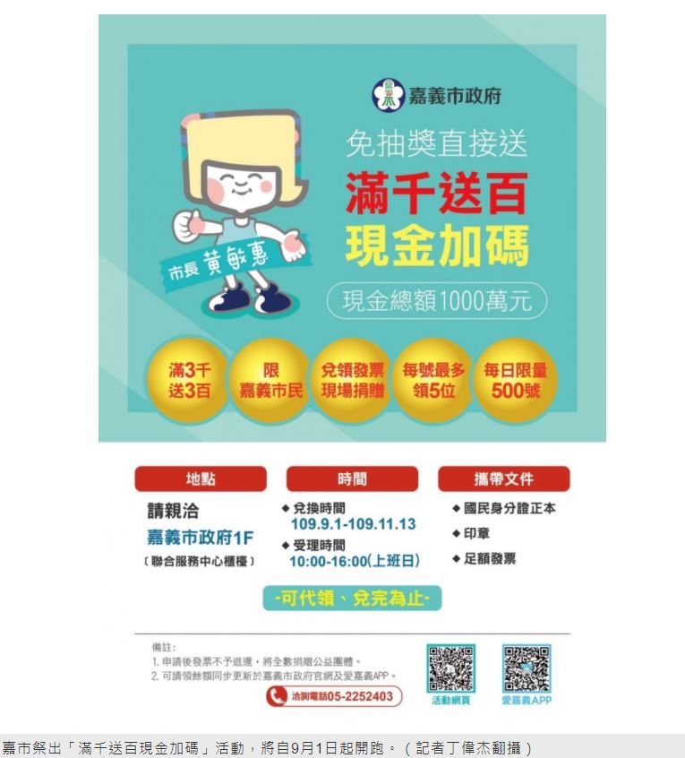 後疫情時期拚經濟!嘉義市將自9月1日起,祭出「滿千送百現金加碼」好康活動,只要是設籍嘉市者,持於嘉市店家消費的統一發票(消費日期為9月1日至11月13日間),累計統一發票金額滿1000元,即可向市府申請振興補助金100元現金,每人申請總金額以300元為限,1000萬元額度用完,即截止受理申請。