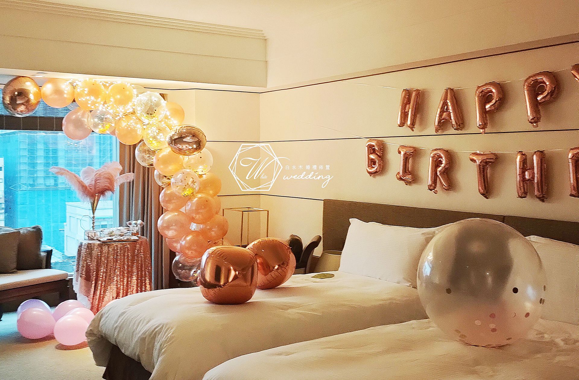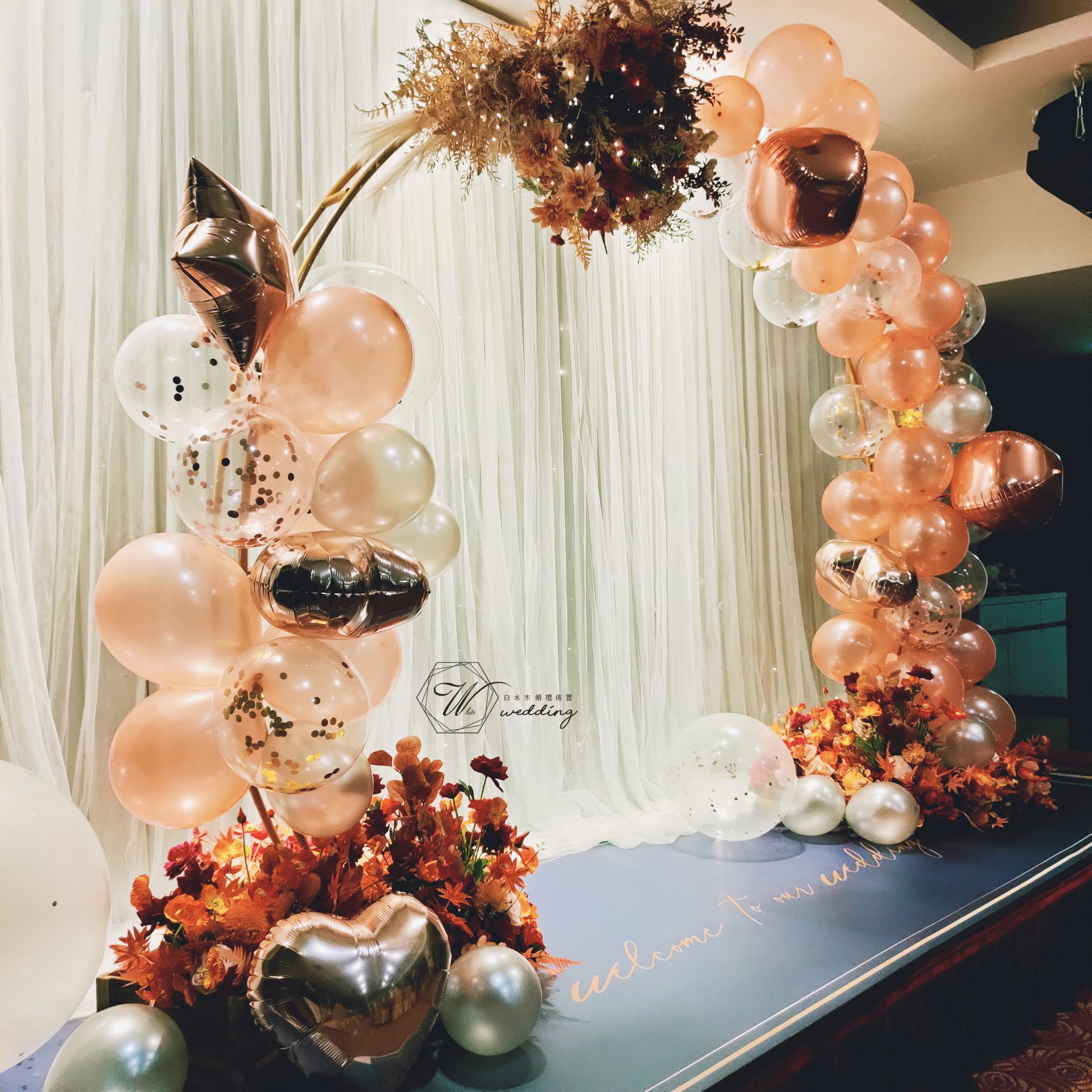 無論是什麼類型的聚會場所,其佈置多元化,感覺就不一樣了。白水木婚禮佈置巧妙利用背板/氣球/花藝設計賦予會場強大的吸引力。
