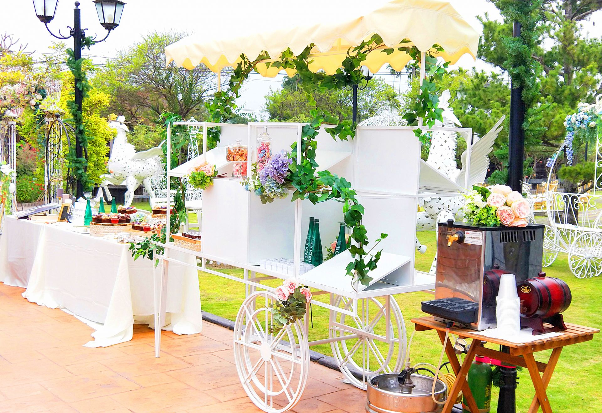 每位新娘都希望自己有個夢幻又浪漫的婚禮,戶外婚禮是個不錯的選擇,因為特別的場地和氣氛,營造美式婚禮風格。證婚儀式的好搭檔絕對就是Candy bar,不僅讓賓客可品嘗小點心之外,也可增添會場佈置的豐富性。 來點迎賓香檳酒或氣泡水,漫遊在戶外森林草原中,是件浪漫的事了!