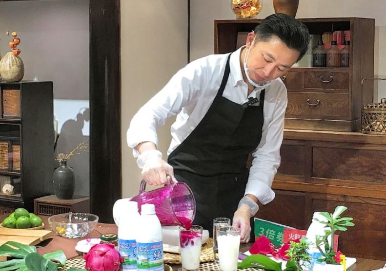 市長林智堅昨開直播促銷,示範使用在地果農種的火龍果,搭配進士鮮奶加特級蜂蜜調製成解渴又清爽、營養價值高的火龍果牛奶。