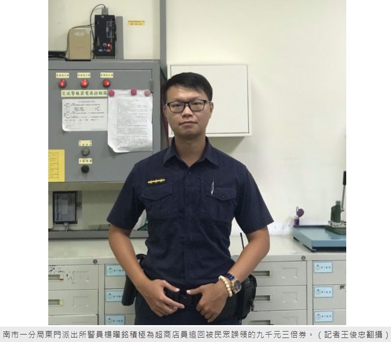 台南市東區龍山街1家統一超商近日求助轄區東門派出所警員楊曜銘,店家告知楊員「因店員操作系統錯誤,致使民眾誤領9千元的3倍券,若未能找回,店員要負責這筆錢損失」。楊員利用瑣碎線索及警政查詢系統比對,很快找到誤領民眾把9千元3倍券繳還店家,解決店員心頭大患。