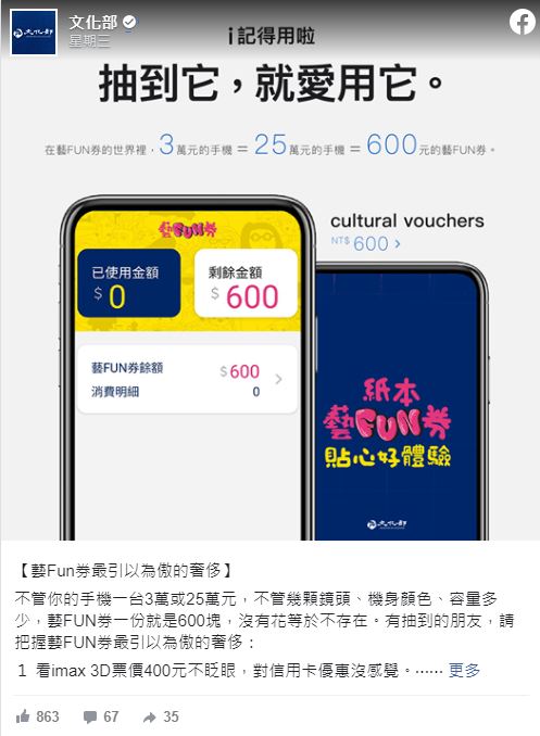 文化部在臉書上將黃山料的言論,配合今日的「iPhone 12發表會」二次創作,表示「不管你的手機一台3萬或25萬元,不管幾顆鏡頭、機身顏色、容量多少,藝FUN券一份就是600塊,沒有花等於不存在」,請有抽到的朋友趕快進行消費,支持藝文產業。