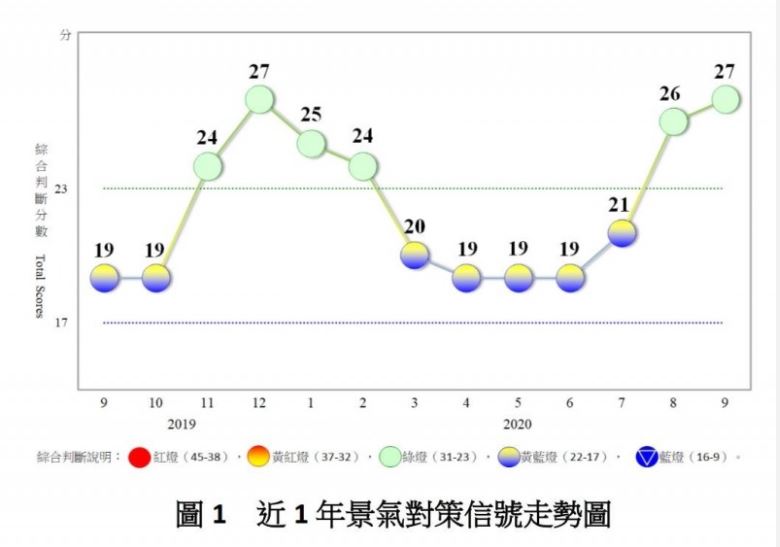 國發會發布9月景氣概況,9月景氣對策信號分數較上月增加1分至27分,燈號續亮「穩定」綠燈,現已連2月亮出綠燈,國發會經發處長吳明蕙指出,景氣領先現已連6月上升,累計增幅7.35%、同時指標則連4月上升,累計增幅3.4%,反映國內經濟逐漸趨穩,但仍須留意國際疫情後續發展。