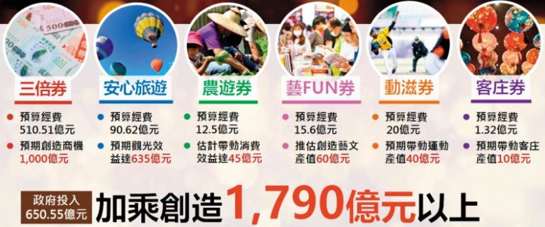 經濟部昨在行政院會報告「推動振興消費措施現階段成果」,經濟部指出,發放三倍券預期創造商機一千億元,加上各部會推動振興消費措施,包括交通部安心旅遊、農委會農遊券、文化部藝FUN券、體育署動滋券、客委會浪漫客庄旅遊券等,政府共投入六五○.五五億元,推估加乘創造一七九○億元以上效益。