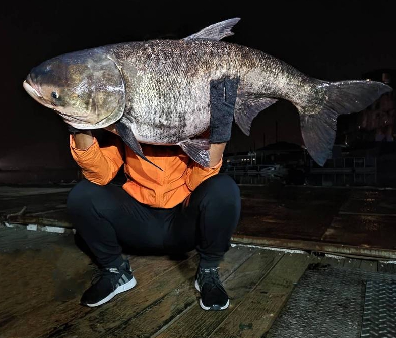 巨無霸大頭鰱出沒!南投當地釣客夜間乘船在日月潭上垂釣,忽然感受到水底傳來一陣猛烈的拉力,奮力與神秘巨物搏鬥後,發現原來是1尾重達42台斤(25.2公斤)的大頭鰱,簡直像是兒童的體重。