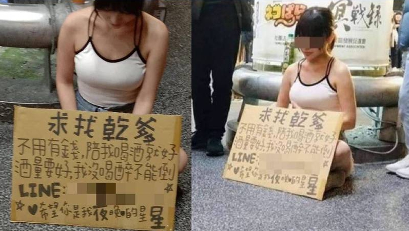 有網友26日在臉書「爆廢公社2館」貼照片表示,他晚上7點在西門町街都看到一名綁馬尾、穿著黑白細肩帶的爆乳妹坐在路邊,手上拿著一個大紙板,寫著「求找乾爹」、「不用有錢,陪我喝酒就好,酒量要好,我沒喝醉不能倒」,並附上LINE帳號,文末還嬌喊「希望你是我夜晚的星星」,當時引起不少路人圍觀,還有員警獲報前往詢問是否需要幫忙。