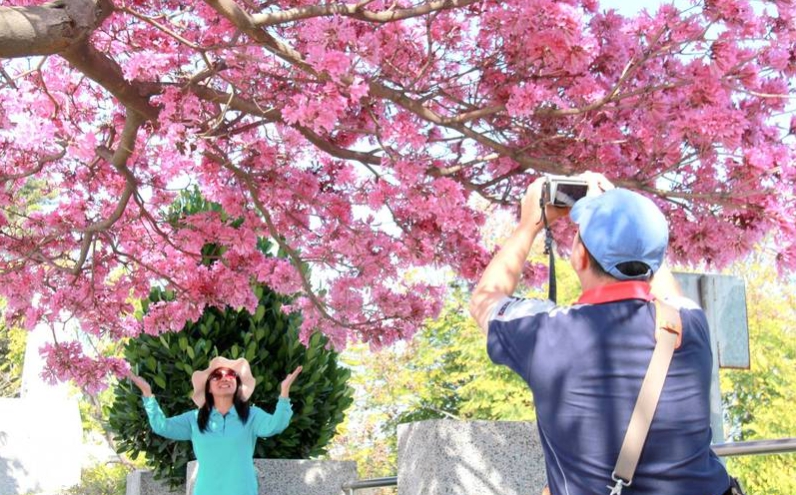 「粉紅警報」來襲!彰化縣社頭鄉崙雅國小圍牆上種植一排紅花風鈴木,近日進入開花期,粉紅色花苞不斷從枝芽冒出,猶如一朵朵粉紅色繡球花懸在半空中,情景美不勝收,有女民眾徜徉花樹下瞬間被征服,眼睛狂冒粉紅色說說「像極了愛情」。