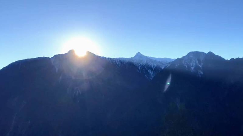 信義鄉民眾陳才毅表示,之前寒流發威,山區天氣型態多屬陰天多雲,得知寒流暫歇後,一早便前往省道台21線新中橫公路等待玉山群峰日出,到場果然天氣穩定,太陽緩緩從山巒透出曙光,迎接冬日驕陽,讓人倍感溫暖。
