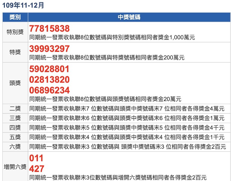 最新一期統一發票開獎!去年11-12月統一發票中獎號碼今天開出,千萬特別獎獎號為「77815838」;200萬元特獎中獎號碼為「39993297」。中獎民眾今年2月6日起可開始領獎,領獎期限至5月5日。