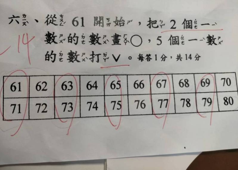 名母親在臉書PO出翻拍自家就讀國小一年級小孩的作業照,只見一道數學題要求「從61開始,把2個一數的數畫〇,5個一數的數打✓」,然而小孩卻全數答錯。照片曝光後,引發網友熱烈討論。