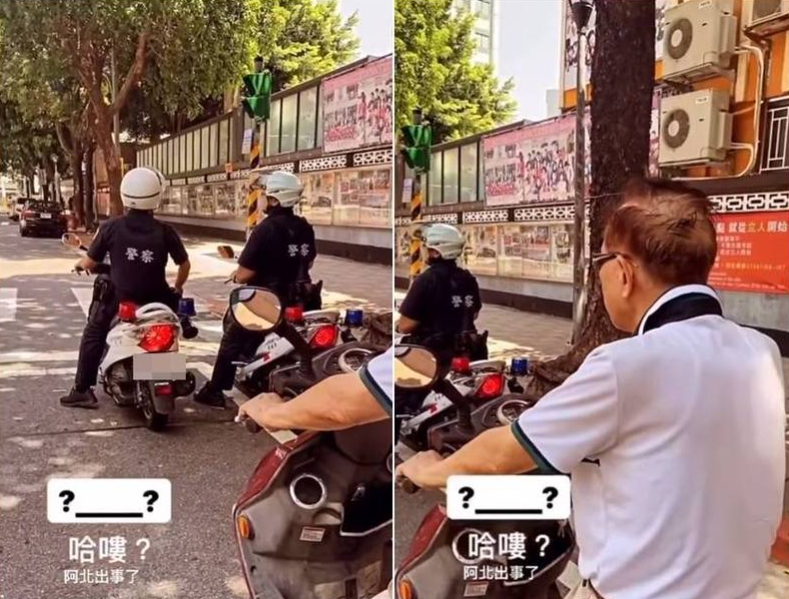 一名網友20日在臉書社團「路上觀察學院」PO出一段影片,可以看到停紅燈時,拍攝者的前方有2名巡邏警察,接著鏡頭轉向拍攝者的右方, 一名沒戴安全帽、穿著白色POLO衫的阿伯好巧不巧就停在警察後面,前面的2名警察似乎在交談沒注意到後方情況,而阿伯竟然就這樣若無其事等紅燈。原PO還忍不住調侃:「阿伯初4惹(阿伯出事了)!」
