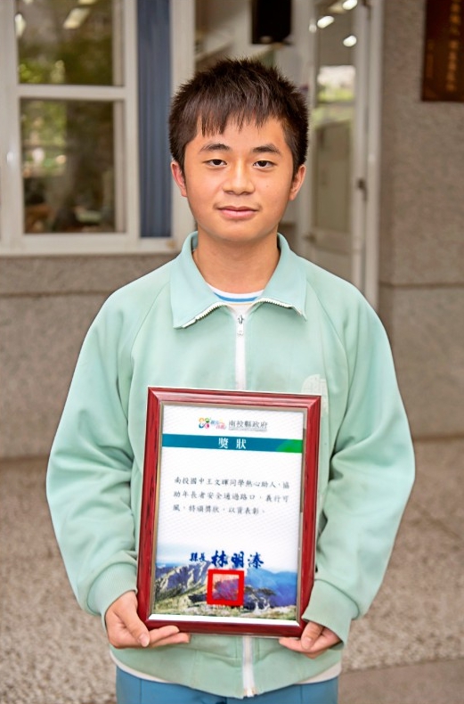 南投縣南投國中三年級學生王文暉,上月10日在南投市南崗二路協助1名持助行器的老人過馬路,剛好被路過車輛行車紀錄器拍下,並上傳到臉書社團,引發網友按讚分享,南投縣政府獲悉循線訪查,肯定學生熱心助人,副縣長陳正昇昨前往學校表揚王姓學生,並請全班同學吃麥當勞,同學們對於意外驚喜也開心不已!