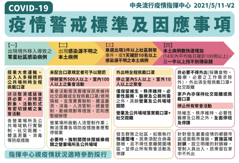 中央流行疫情指揮中心11日宣布將疫情警戒提升到第二級,警戒至6月8日,(12日)通報新增16例本土病例,刷新台灣武漢肺炎(新型冠狀病毒病,COVID-19)疫情單日新高,且確認已出現社區感染。衛福部長陳時中坦言,若警戒提升至第三級,屆時將嚴禁室外10人以上,室內5人以上之聚會。