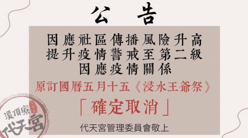 因應武漢肺炎(新型冠狀病毒病,COVID-19)本土疫情升溫,安南區溪頂寮代天宮原訂於15日舉辦的「浸水王爺祭」確定取消,其中包含遶境、平安宴及文化市集、表演等有人潮群聚疑慮的大型活動;另,按古禮前往南鯤鯓參香、巡五營及請王等科儀,將由廟方人員在人數管制下自行辦理!