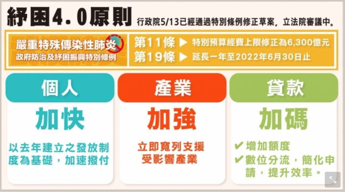 除此之外,行政院表示,本次紓困4.0有三大原則:加快、加強以及加碼。