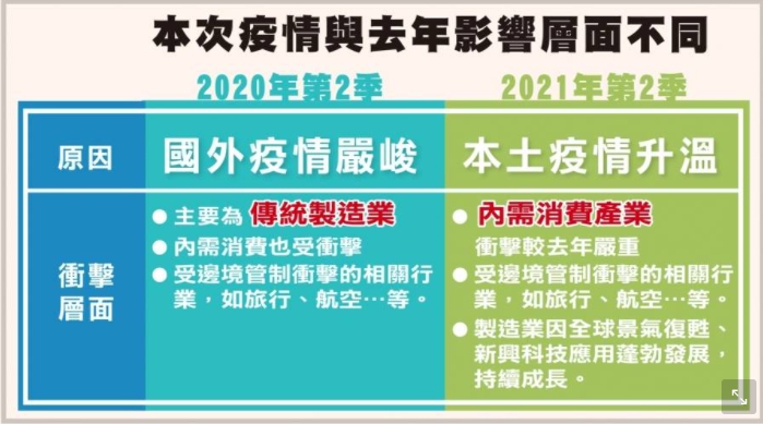 在行政院院會上,國發會主委龔明鑫也強調,上一波的疫情主要發生於國外,台灣受到衝擊的是製造業,本次疫情主要是內需產業受到影響,將會針對內需產業進行紓困。明顯受到衝擊的產業包含休閒娛樂業、觀展觀賽業、教育學習業,其他還有餐飲、零售、運輸、旅遊、航空與住宿等。相關的紓困、貸款等措施,最快預計於6月初上線。