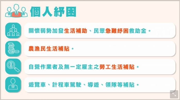 其他包含農民、漁民1萬元、甲級漁工3萬元的紓困補助也都照舊。影響較大的導遊、領隊、國旅領團人員、計程車與遊覽車司機也有3萬元的補助。