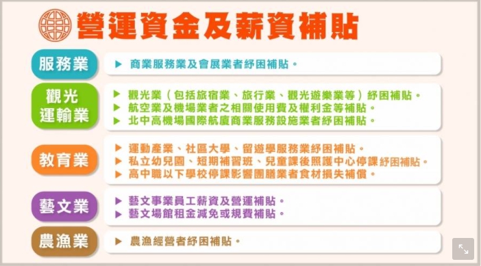 在產業方面,原訂的標準為「營收受到衝擊50%以上,補助薪資4成,上限為2萬元」,目前預計將從寬認定,原則上按員工人數補貼薪資每月2萬元,但細部的資訊仍待定。針對的產業包含服務業、觀光業、教育業等。