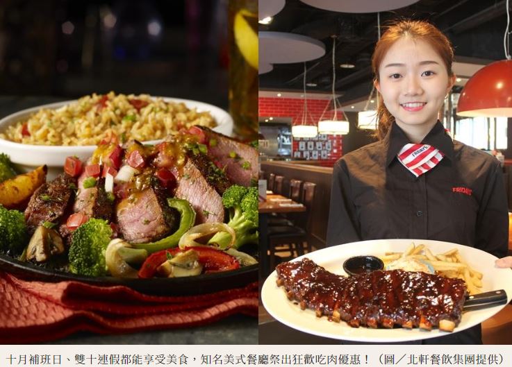 迎接十月補班日、雙十連假,北軒餐飲集團旗下兩大美式餐飲品牌連續兩週推出狂歡吃肉優惠,補班日單日限定TGI FRIDAYS指定牛排買一送一、Texas Roadhouse德州鮮切牛排全系列牛排第二客半價;雙十連假期間10月11日TGI FRIDAYS豬肋排買一送一,而10月10日至10月11日到Texas Roadhouse德州鮮切牛排點購任一客牛排則可享第二客半價。