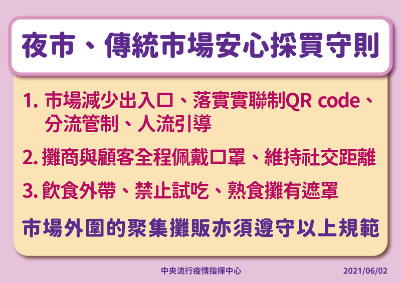 安心採買守則包括,第一,市場減少出入口、落實實聯制QR code、分流管制及人流引導;第二,攤商與顧客需全程配戴口罩、維持社交距離;第三,飲食外帶、禁止試吃、熟食攤有遮罩;另針對市場外圍的劇集攤販亦須遵守以上規範。
