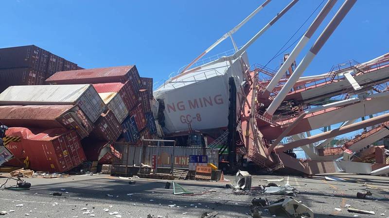 經初步了解,該艘貨輪貨輪先撞8號機,致1人受傷,隨即再撞上6號機,2名作業工人受困。起重機及貨櫃瞬間倒下,所幸底下作業人員跑得快,無人傷亡。