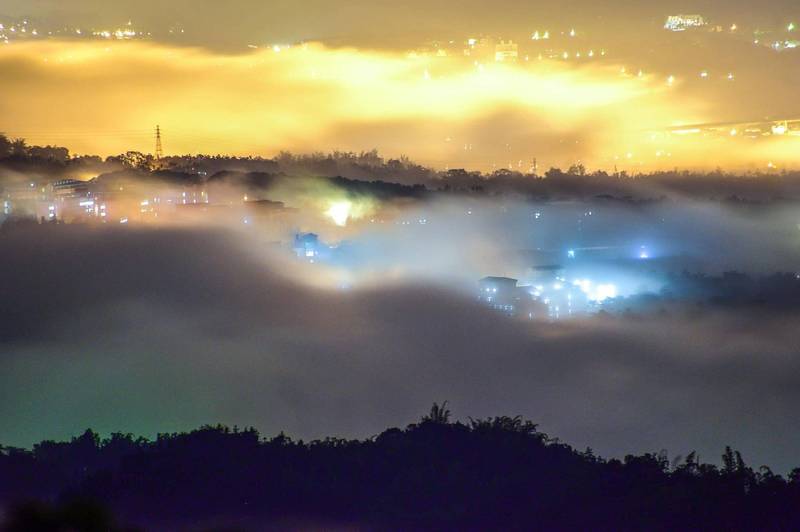 陳琪元說,暨大校區夜間有多種光源,色溫不同,當水氣較多產生的雲霧覆蓋其上,經由不同色溫的光線投射在雲海上面,產生了光暈效果,從校區對面望去,就呈現如海上藍眼淚的效果。